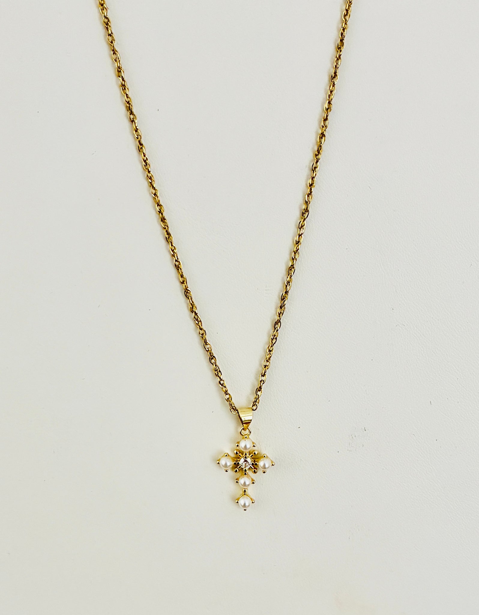 This necklace features a pearl cross pendant with a simulated diamond in the center, hanging from a 16-inch double round stainless steel chain that includes a 2-inch extension.