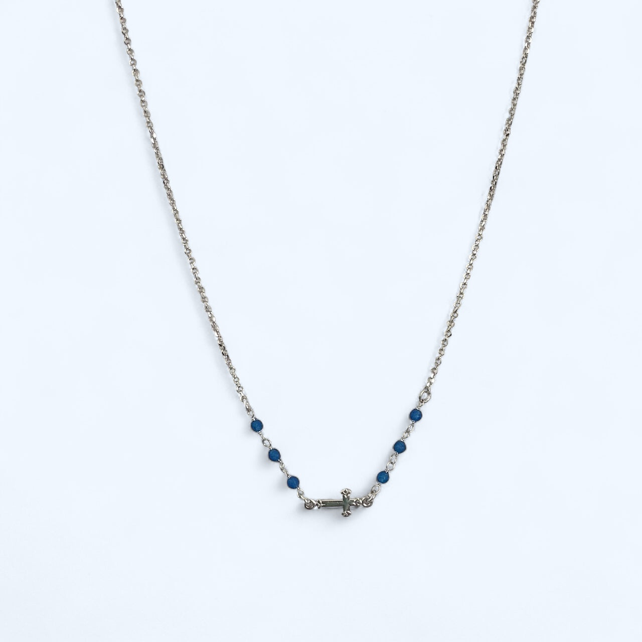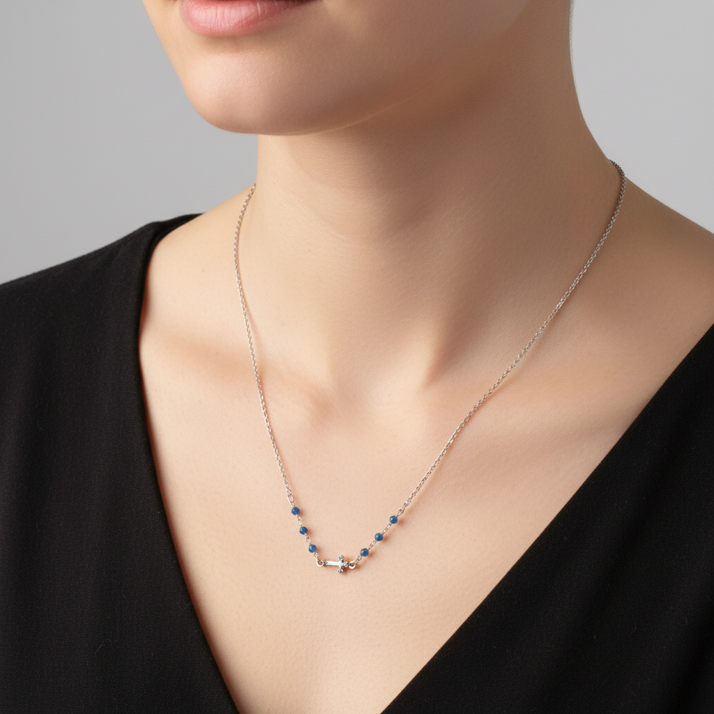 This elegant Blue Bead Sideways Cross pendant is crafted from sterling silver and hangs on a 16-inch link chain with a 2-inch extension for adjustable length. Its subtle design makes it a versatile accessory for everyday wear, combining meaningful symbolism with a delicate touch.