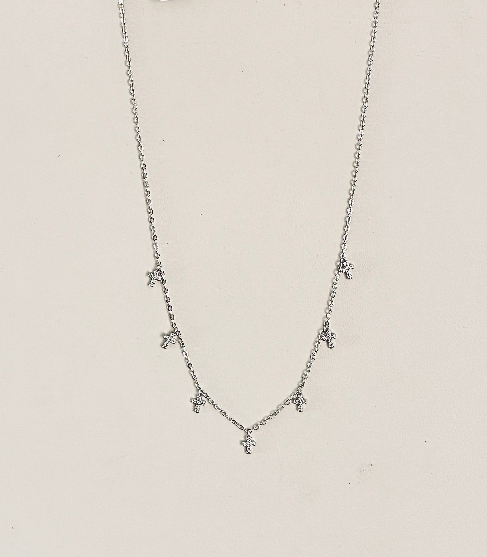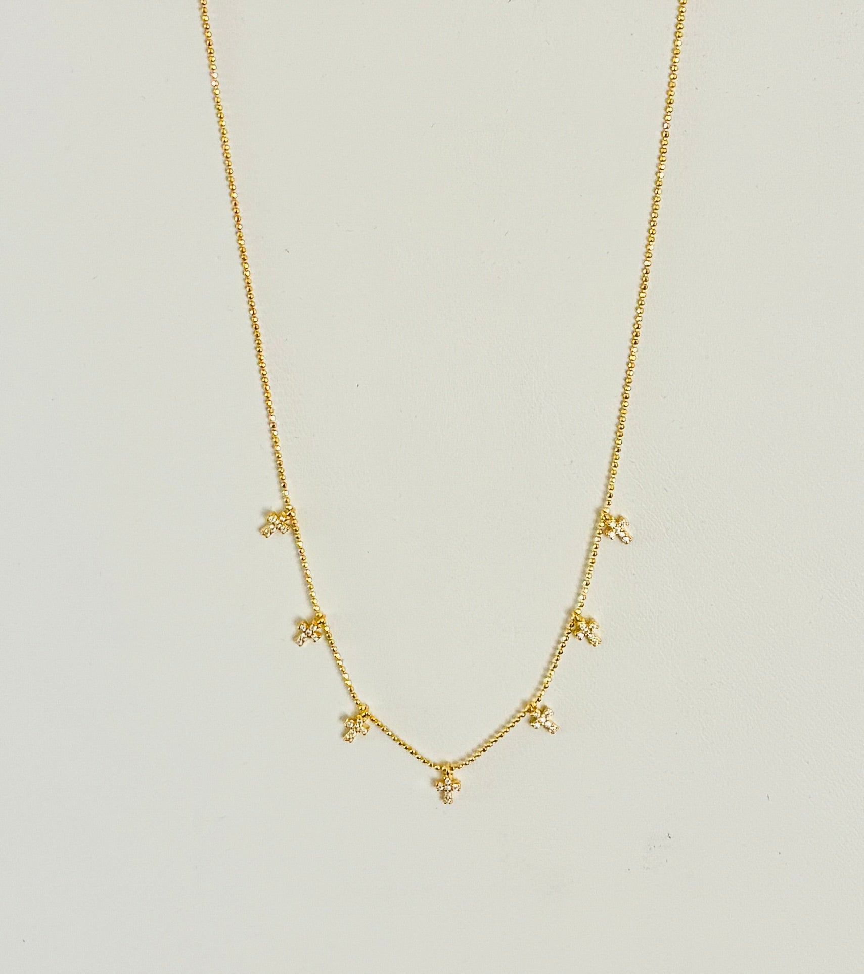 This Seven Cross Necklace features a gold-over-silver finish on a 16-inch beaded chain with a 2-inch extension for adjustable length. It secures with a lobster clasp, combining style and comfort. Perfect for everyday wear or special occasions. Buy with confidence.