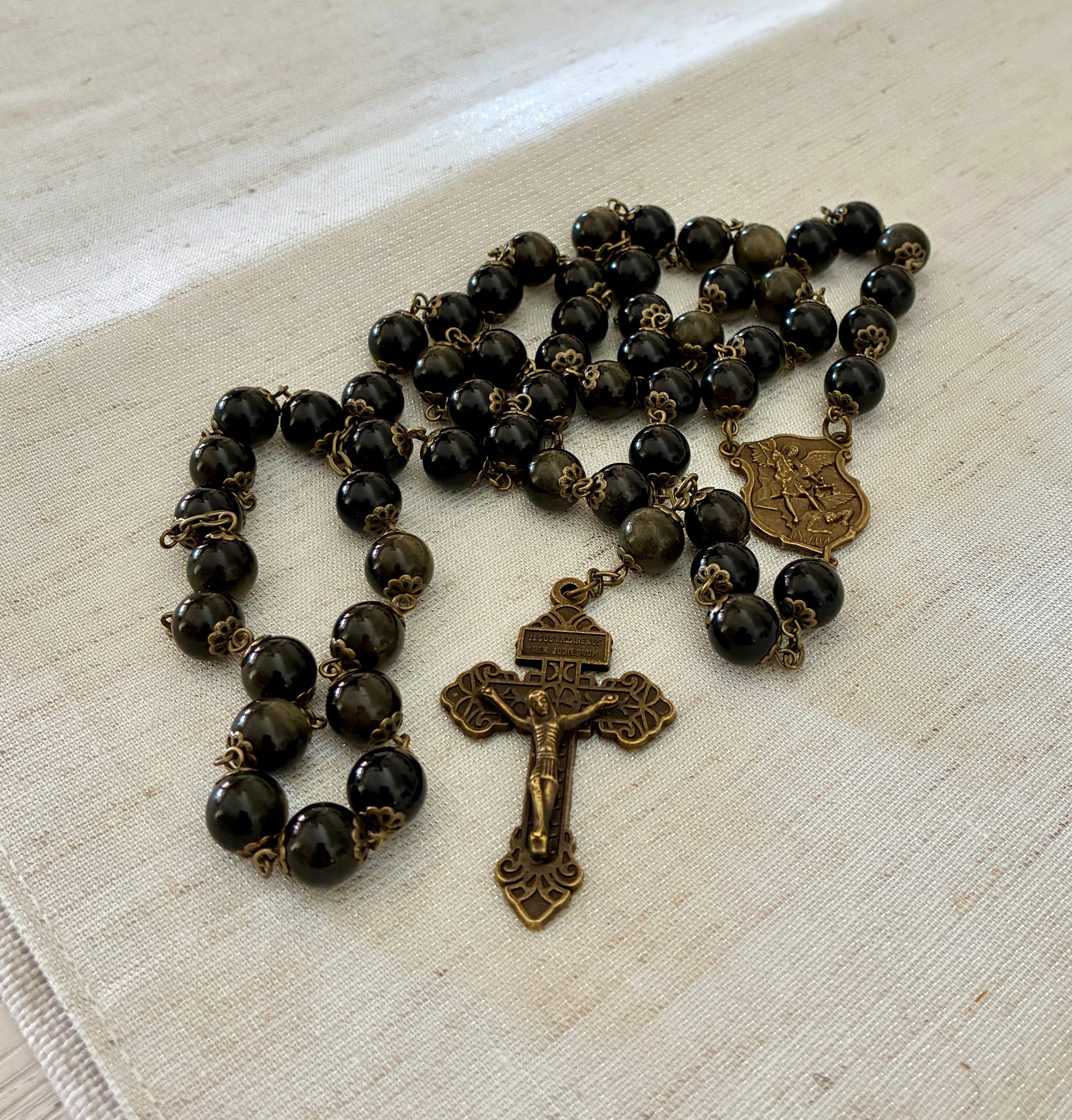 Crafted with precision, this rosary features deep black obsidian stones set against a rich bronze finish, combining natural elegance with durable craftsmanship. Known for its grounding properties, obsidian enhances spiritual focus, while the bronze adds timeless strength and a warm, classic aesthetic. Ideal for both prayer and meditation, this rosary offers a meaningful tactile experience for those seeking a durable and visually striking devotional accessory. Miraculous center.