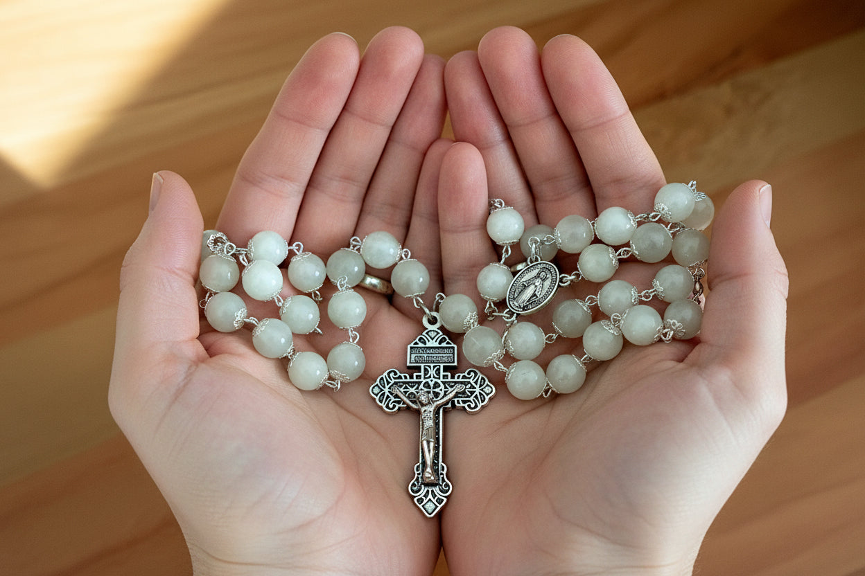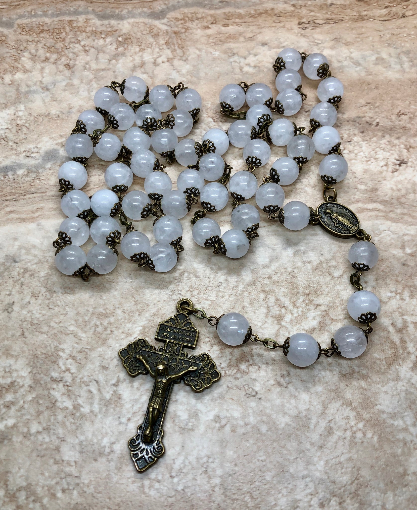 This beautiful rosary features genuine moonstone beads paired with a bronze miraculous center and pardon cross. Each piece is handcrafted with care, combining natural stone with traditional religious symbolism. Perfect for daily prayer or as a meaningful spiritual gift.