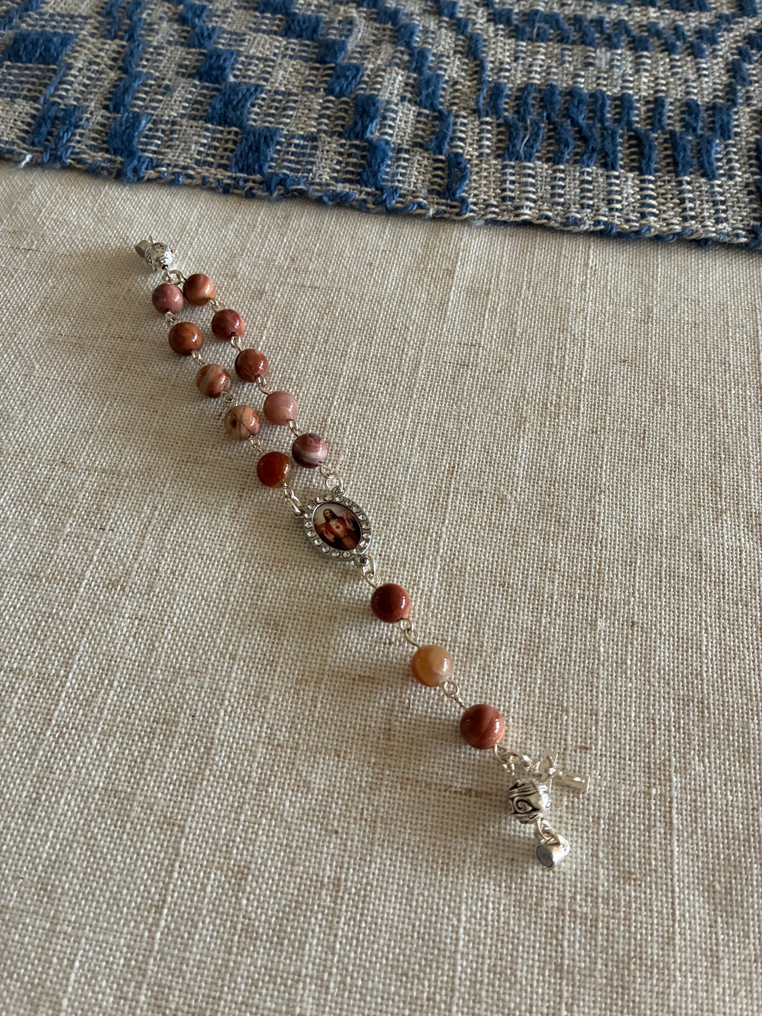 Handcrafted banded agate bracelet with a sacred heart surrounded by cubic zirconia's and magnetic clasp. Natural striped beads paired with meaningful symbolism make this an elegant devotional accessory for daily wear or gifting.