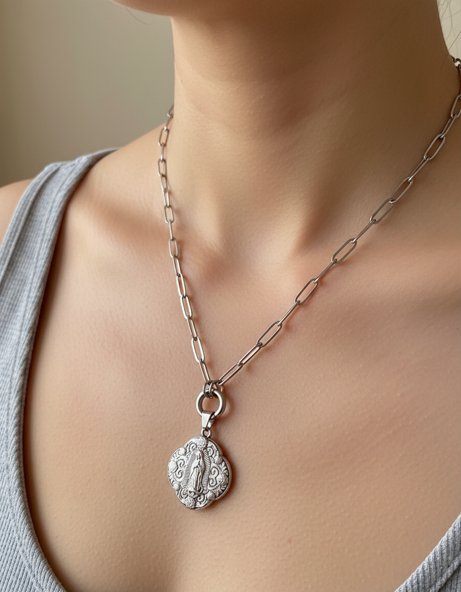 This Our Lady of Guadalupe pendant features a durable stainless steel design and comes with a versatile paperclip-style chain. The chain allows you to easily switch between different pendants, giving you the flexibility to customize your look. Perfect for everyday wear, this pendant combines meaningful symbolism with practical style. Our lady is on both sides of pendant. Paperclip chain s tarnish resistant and waterproof. Buy in confidence.
