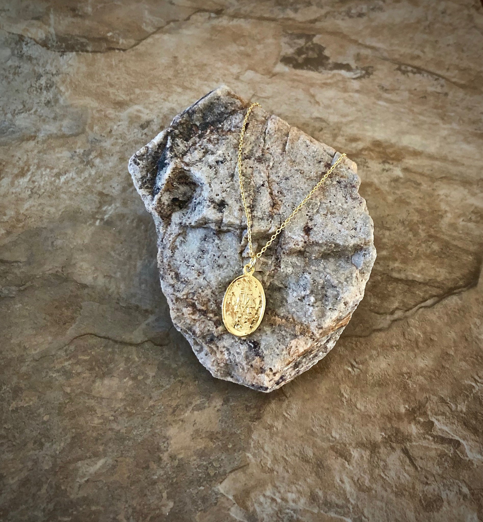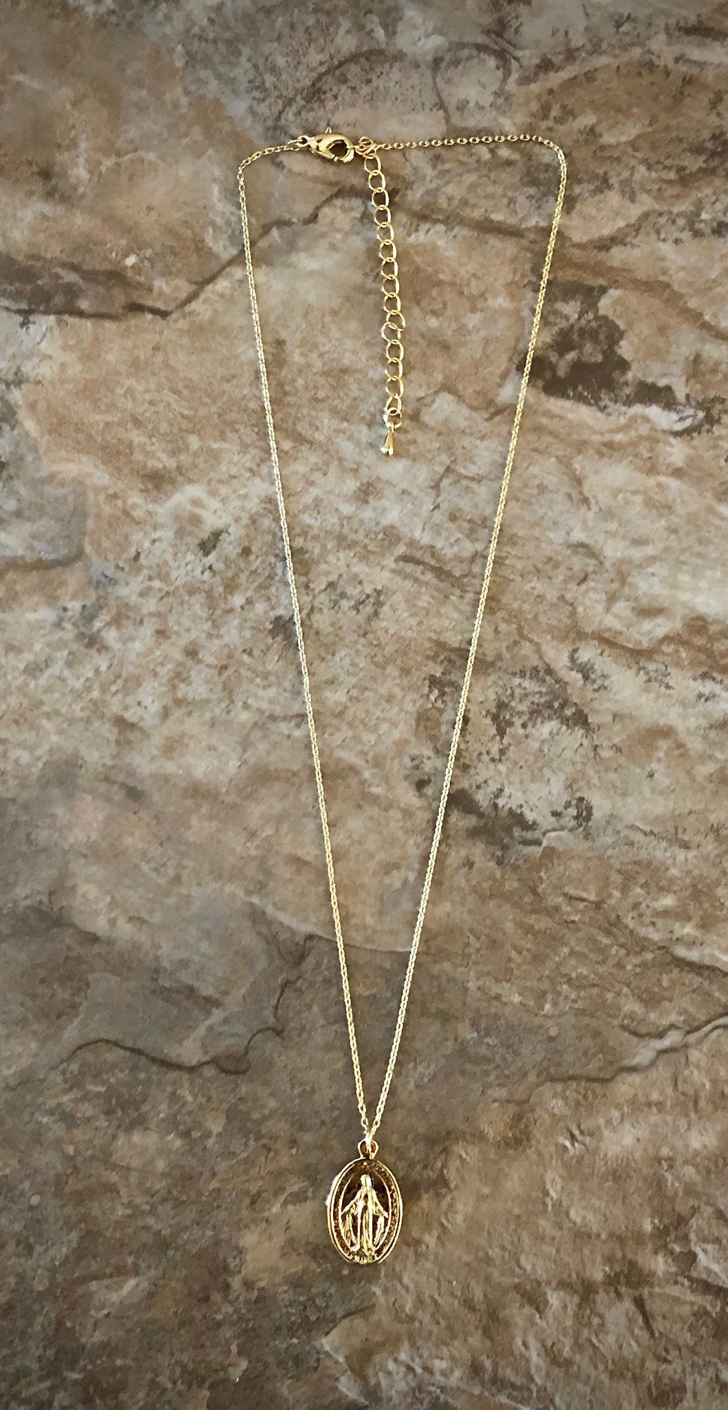 This beautiful 18K gold plated bronze Blessed Mother oval necklace is suspended on a 16" chain with full extension to 18" length.  It has a lobster clasp for extra security.  Available in 3 finishes, Matte Gold, Shiny Gold and Silver Oxide. Made in the USA