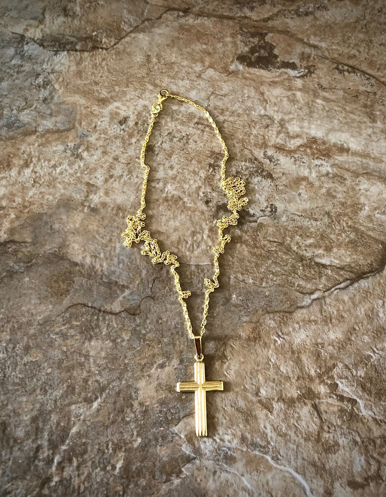 Simple gold plate over silver cross pendant on a 20" snake chain.