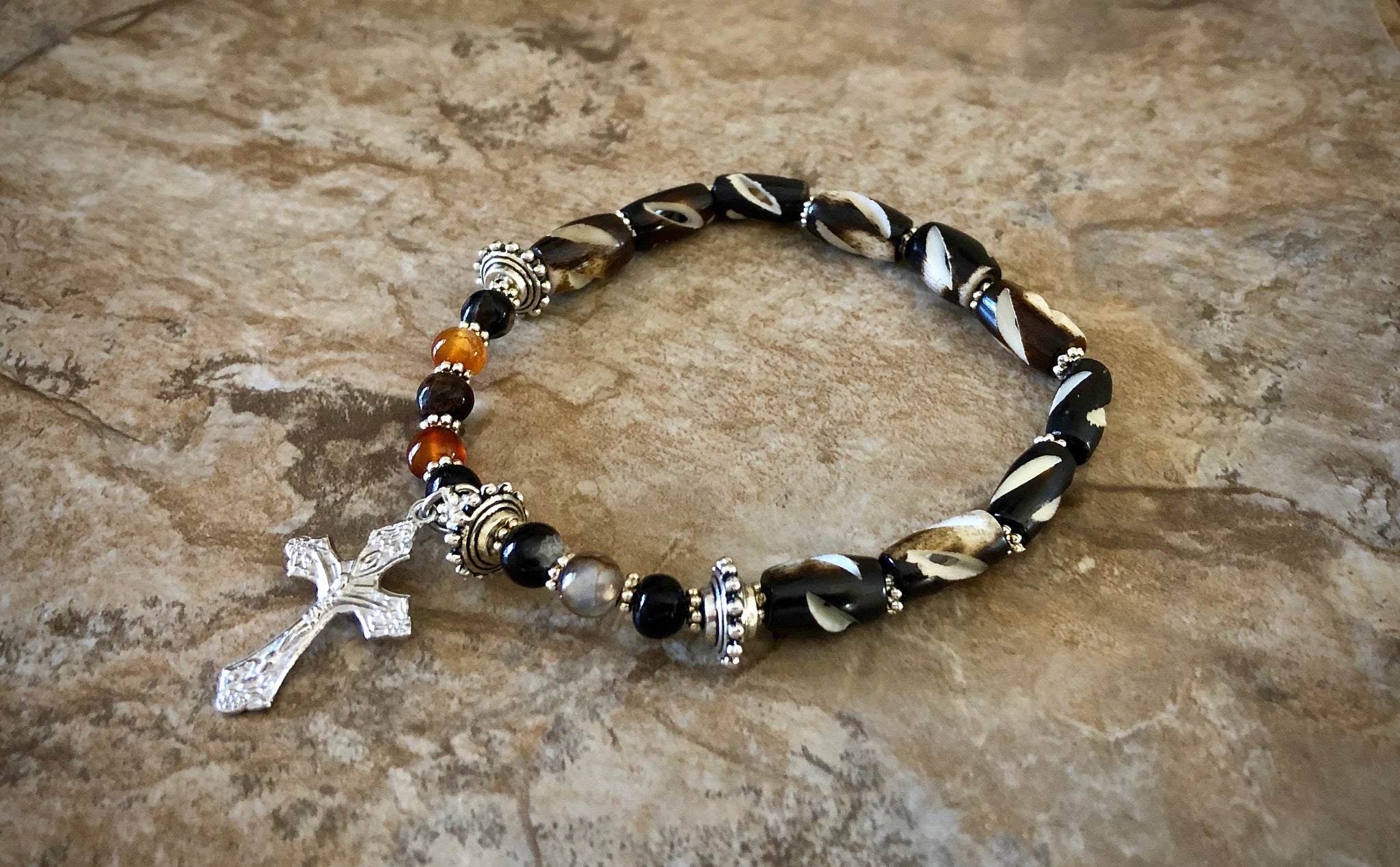 Beautiful two tone combination of geniune amber and shell one decade stretch bracelet. Made by hand in Phoenix, AZ for SignsOfTheCross.