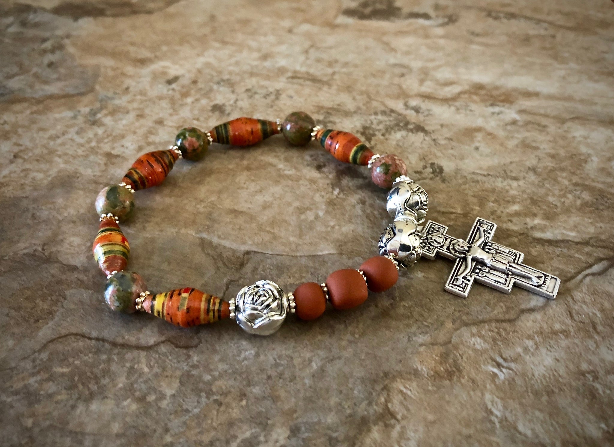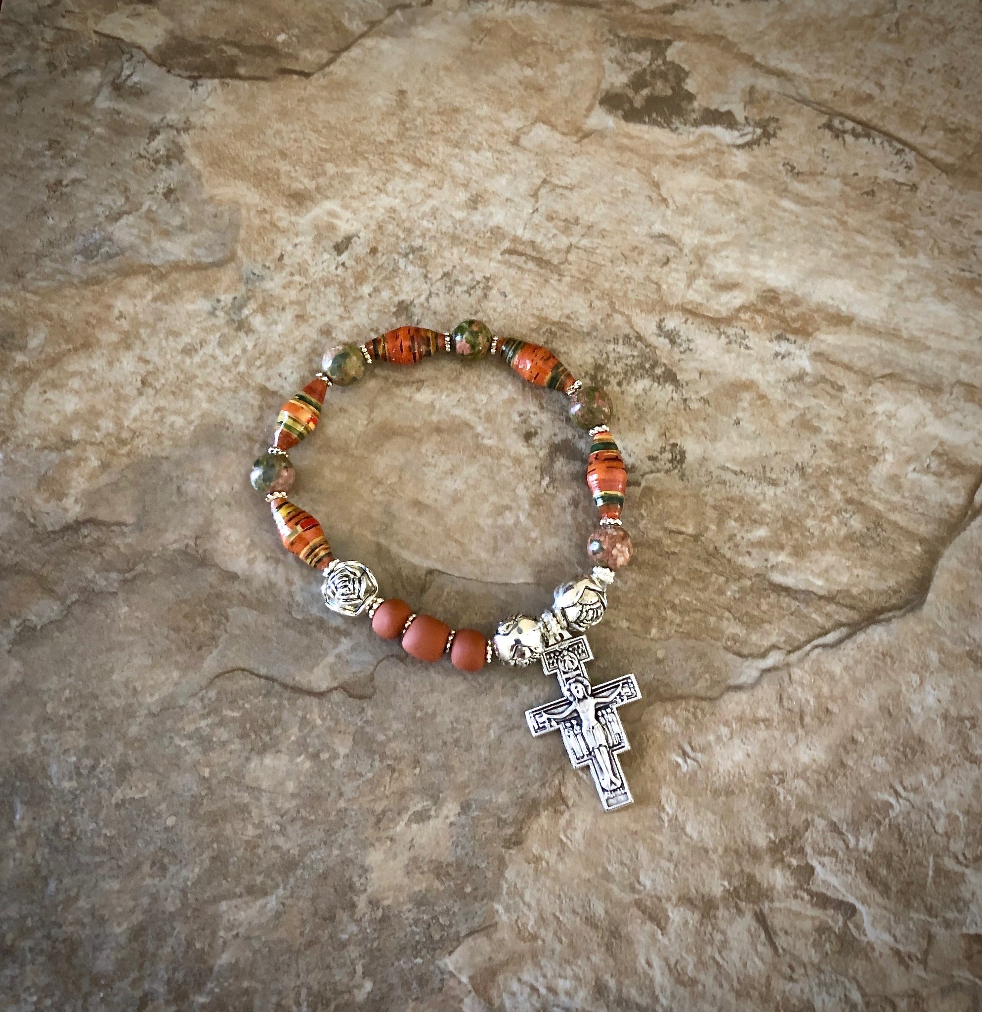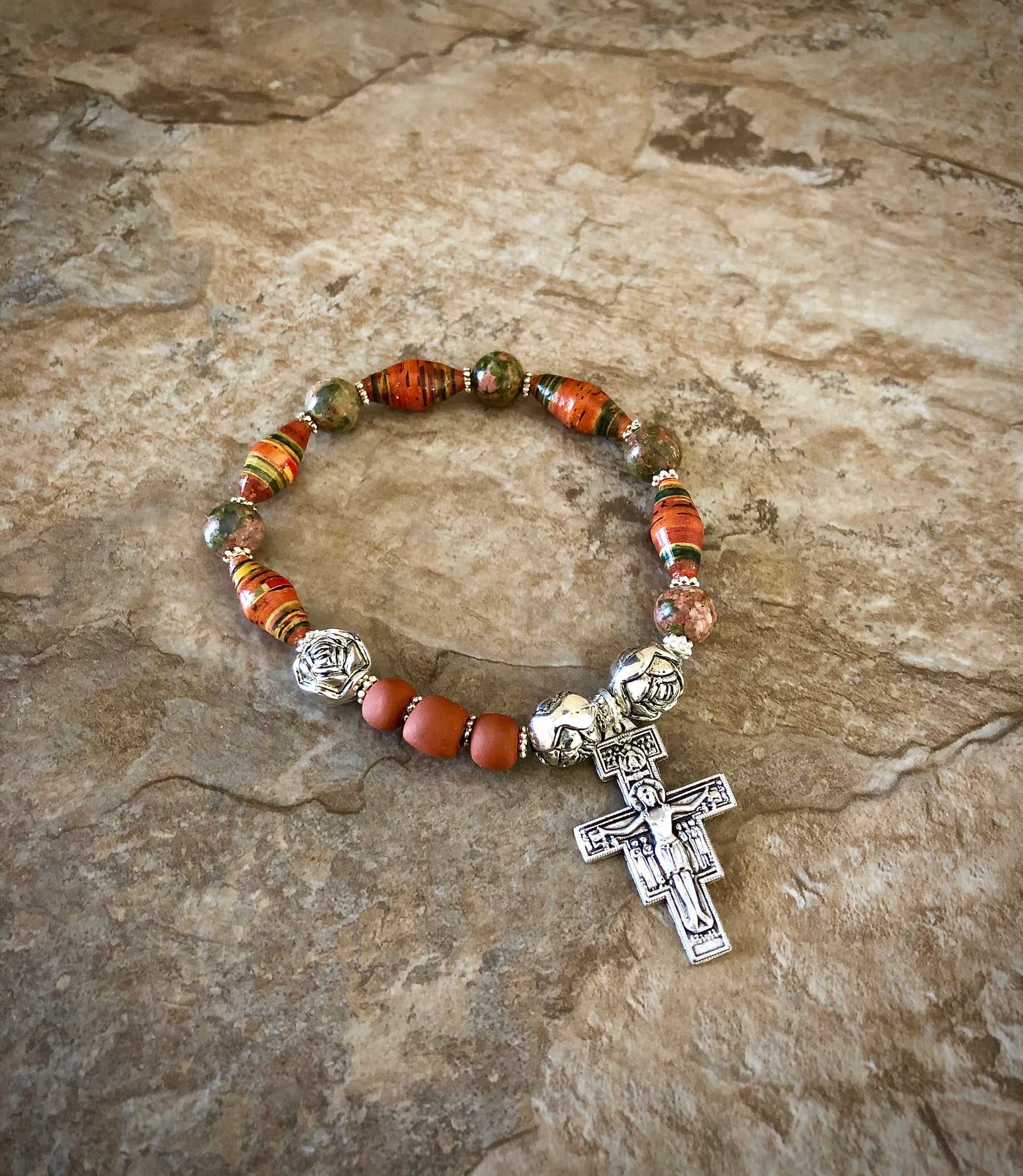 One decade rosary bracelet comprised of handmade beads, unikite and clay San Damiano cross.