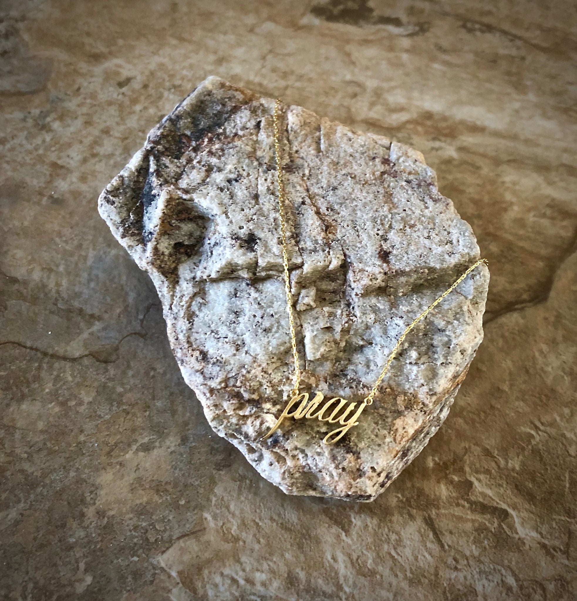 Delicate 18K plated bronze festoon "pray" necklace suspended on a 16" serpentine chain with 2" extension and lobster clasp. Last One