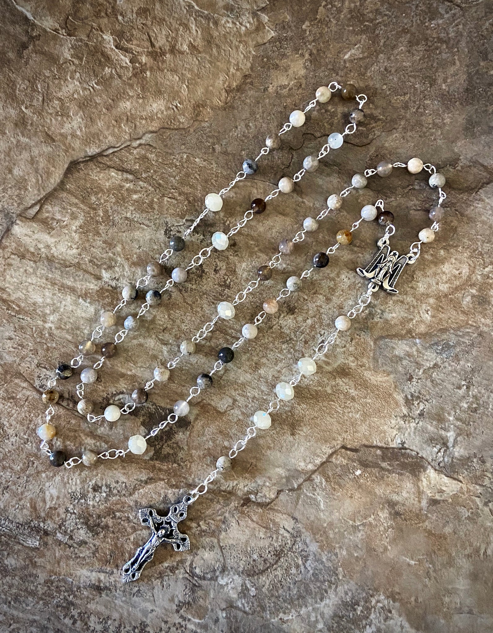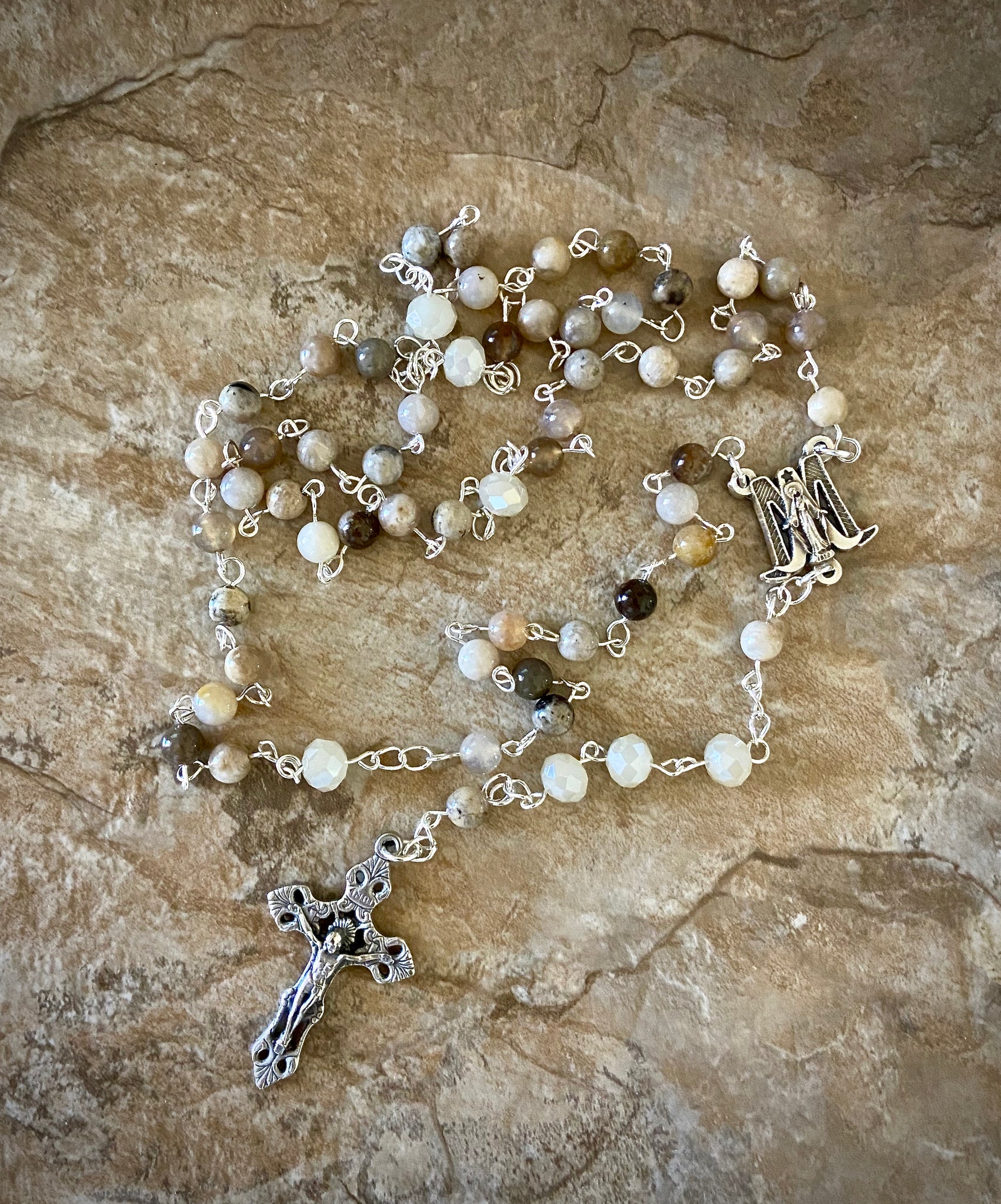 Beautiful 6MM Fossil Coral rosary with 8MM Czech crystal paters.