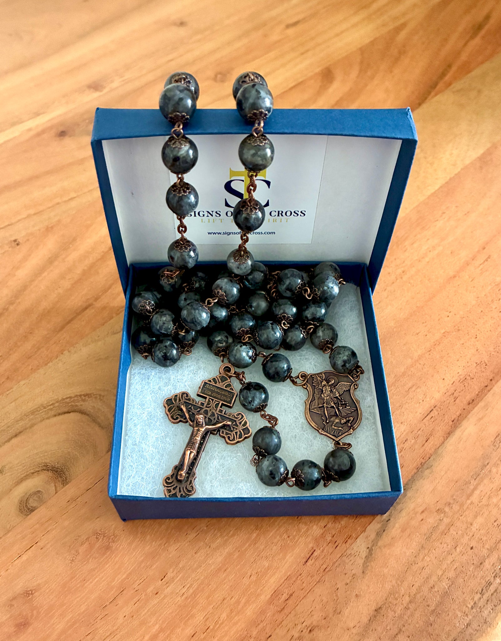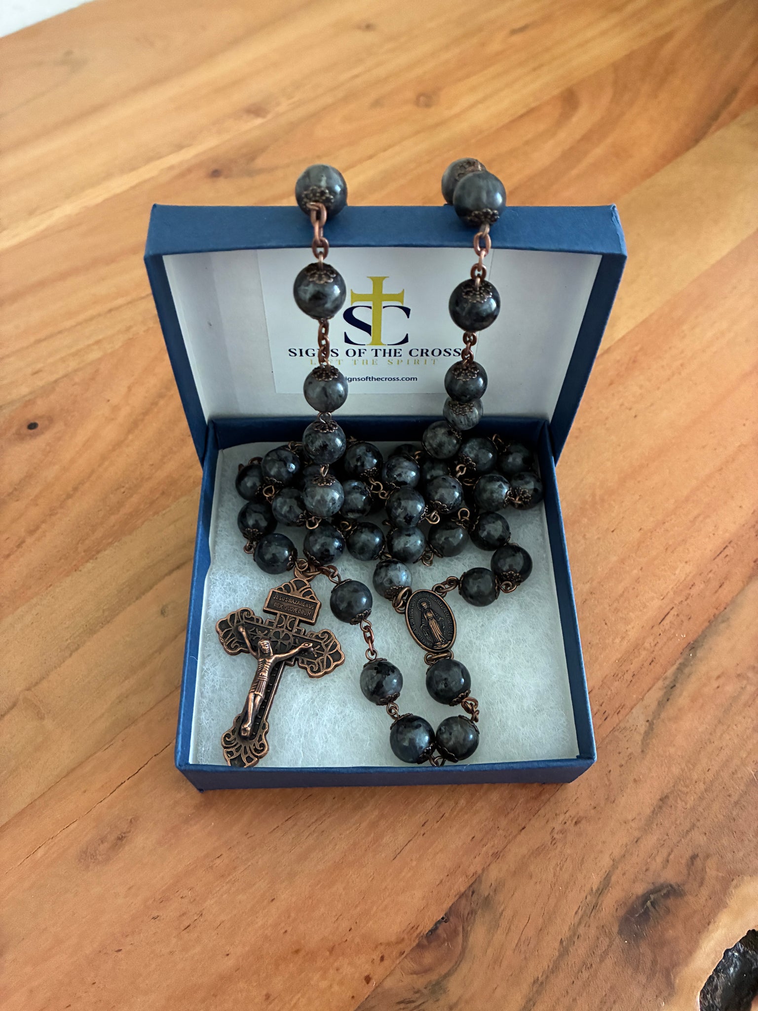 This rosary features genuine Larvakite stones paired with a copper chain, creating a beautiful and durable design. It includes a St. Michael center and a Pardon crucifix, making it a meaningful accessory for prayer and reflection. Available in Miraculous.