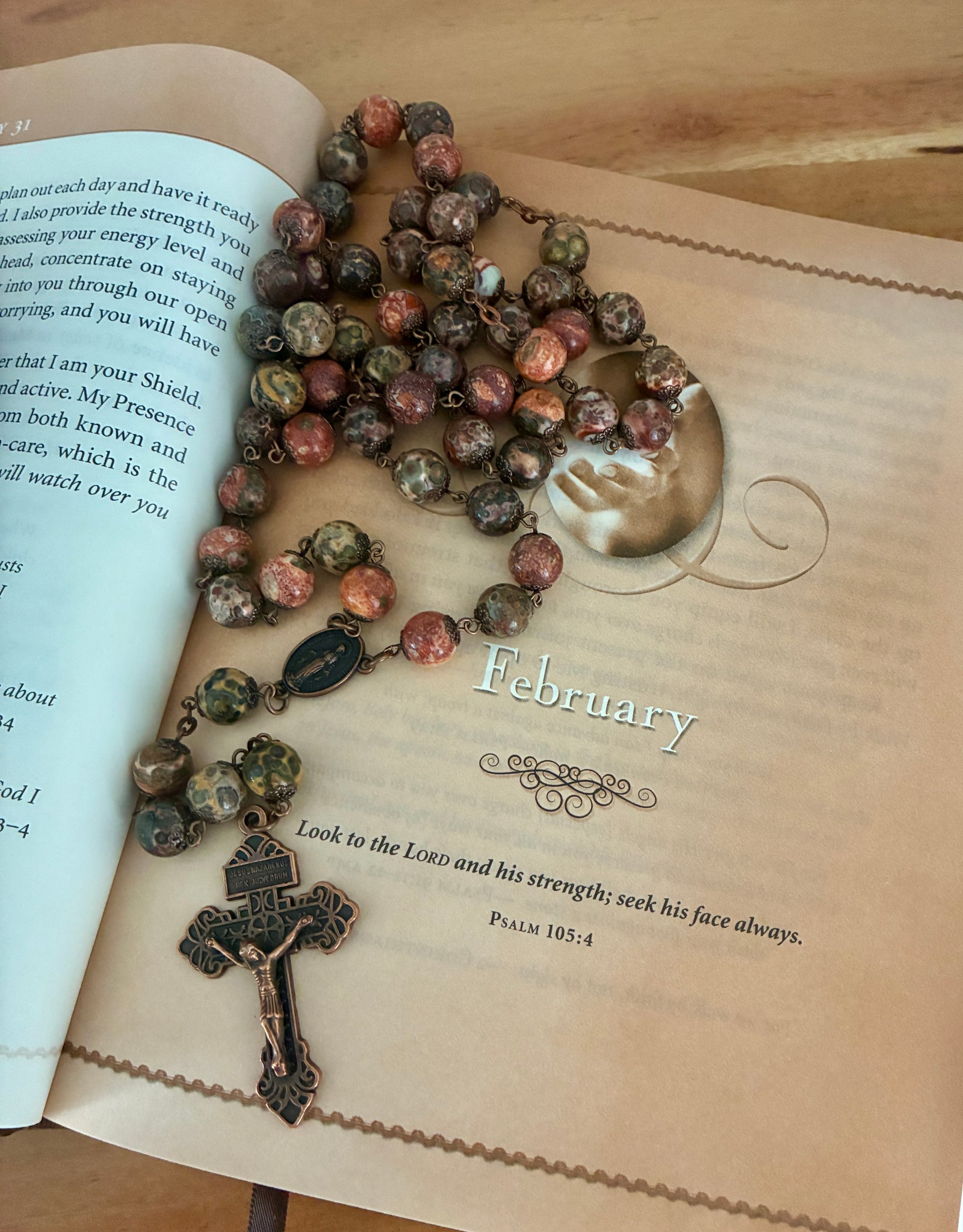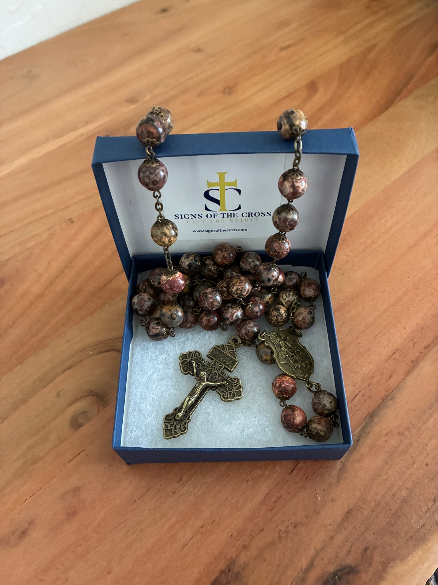 This handmade piece features a 10mm leopard skin stone set in bronze, accented with a pardon cross. Its natural patterns and warm copper tones create a unique accessory that combines earthy beauty with meaningful symbolism. Perfect for those who appreciate handcrafted, rosaries. Available with a St. Michael and Miraculous center.