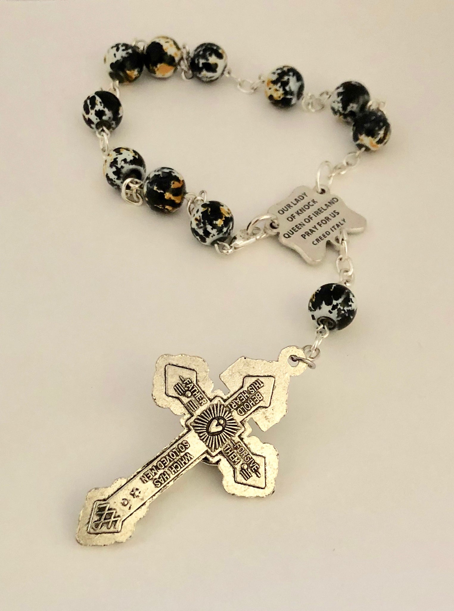 Stunning multi color glass one decade car rosary with lobster clasp.  This special car rosary is made with a Pardon Cross.