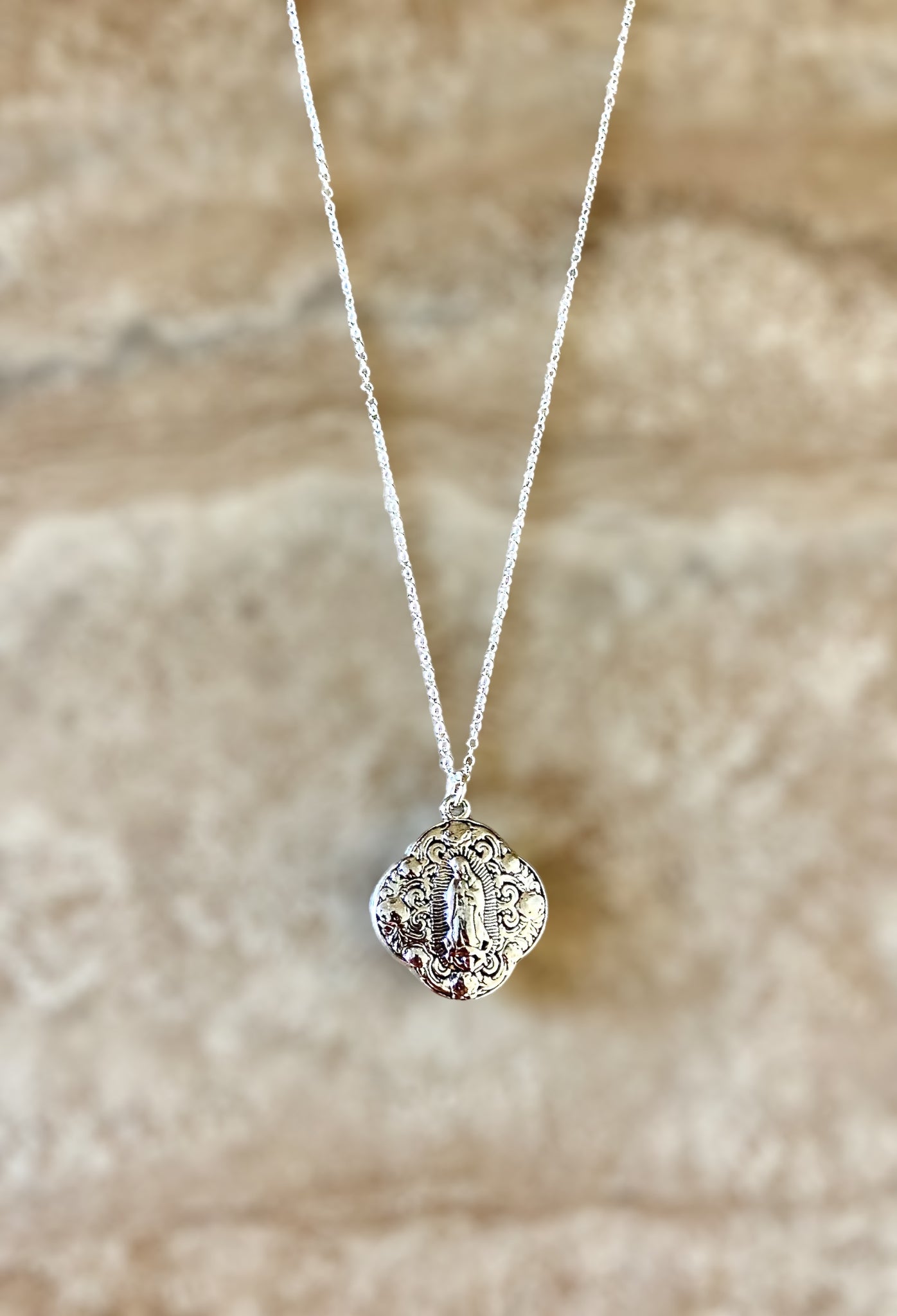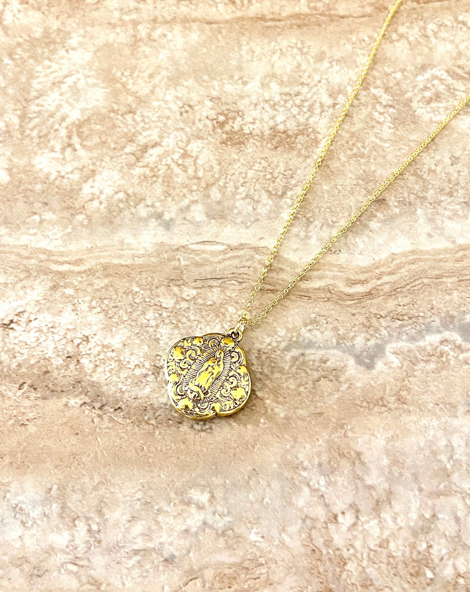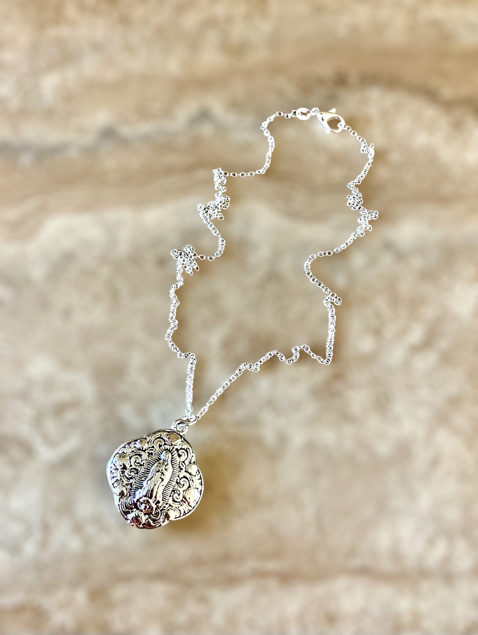 Hollow, almost 3 dimensional Our Lady Of Guadalupe pendant suspended on a 20" sterling silver link chain. The goldstone version is suspended on a 22" link chain. A beautiful look!