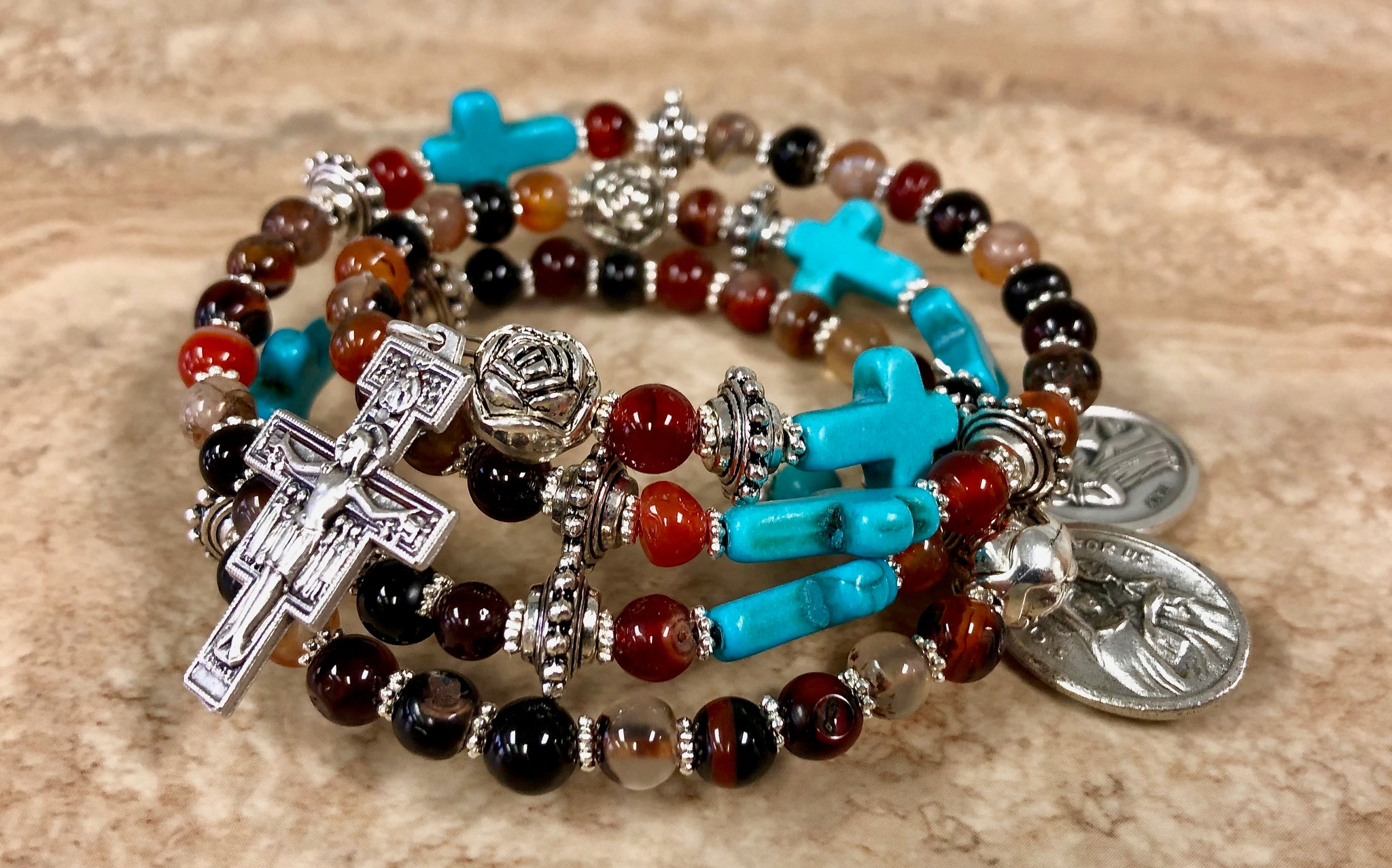 A complete five decade rosary uniquely handcrafted in Amber Agate and Magnesite. This beautifuly designed rosary bracelet from the Images Of Passion Collection is exclusively handmade for SignsOfTheCross in Phoenix, AZ. Wear it in confidence.