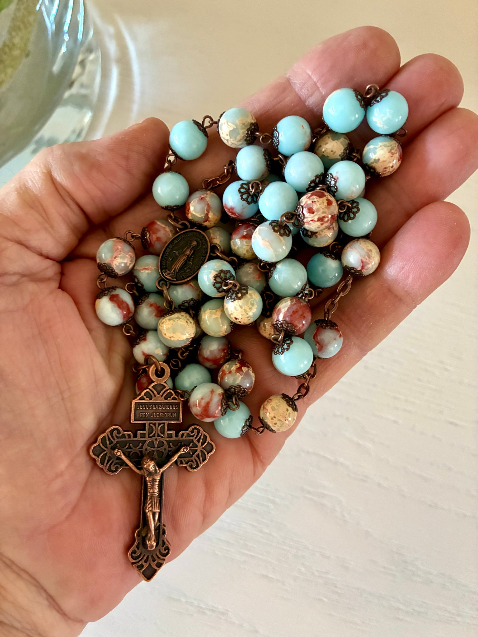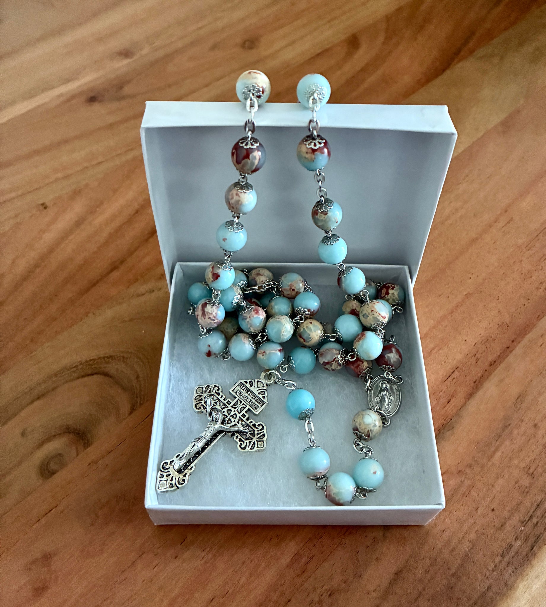 This genuine snakeskin stone rosary features beautiful blues and creams, hand-crafted with copper accents. Its unique stones and warm copper tones create a meaningful and elegant prayer experience, combining natural beauty with durable craftsmanship.  Available in silver.