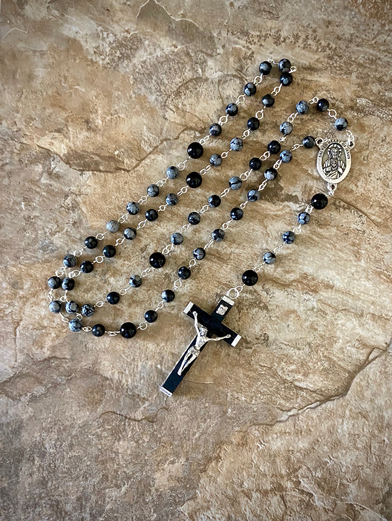 Genuine snowflake obsidian and onyx gemstone rosary handcrafted with 6 and 8mm beads and wooden crucifix in silver. Sacred Heart of Jesus Pray for Us center.